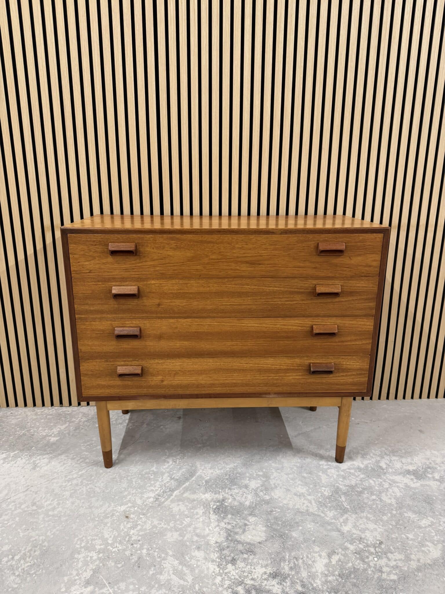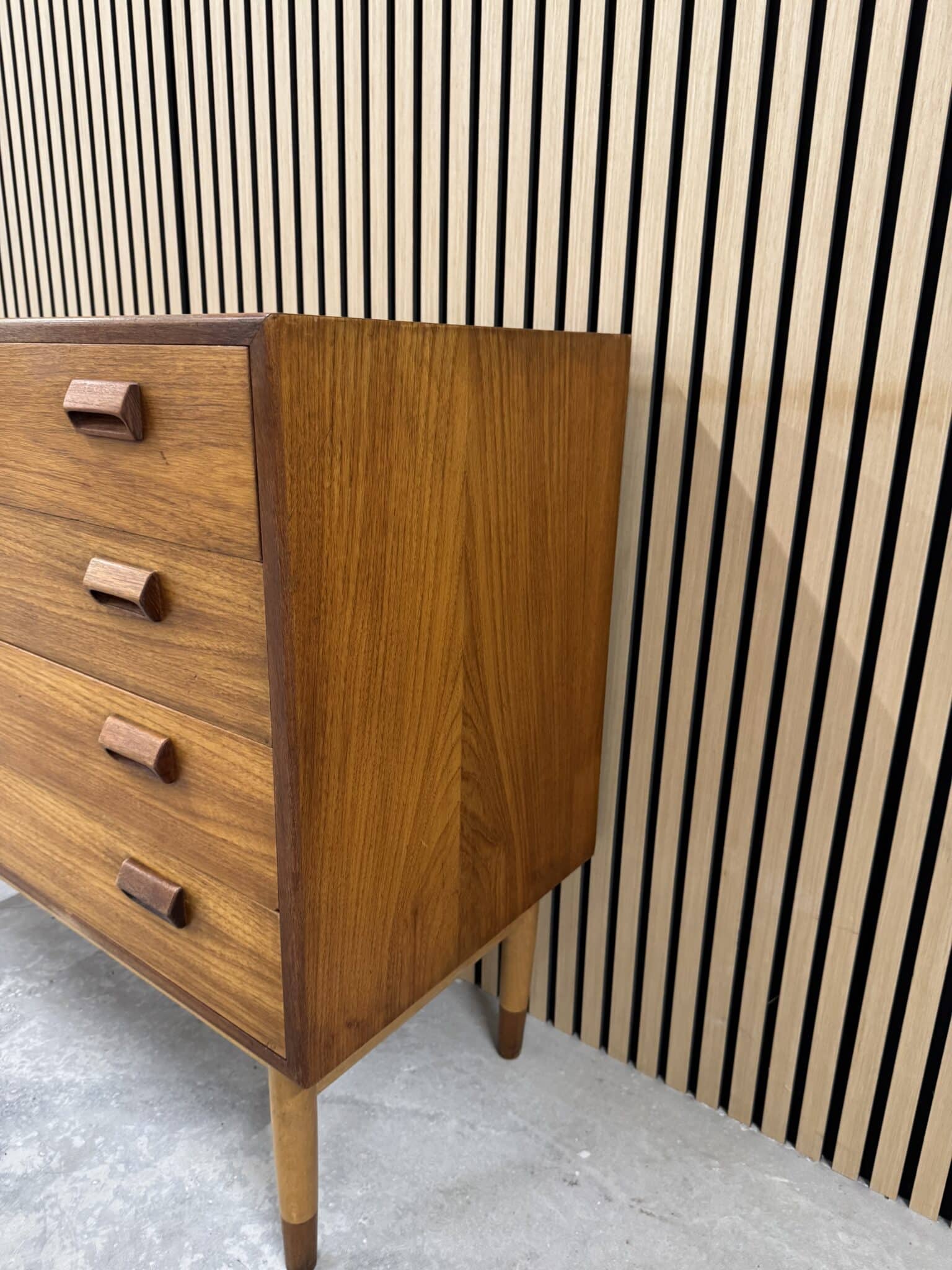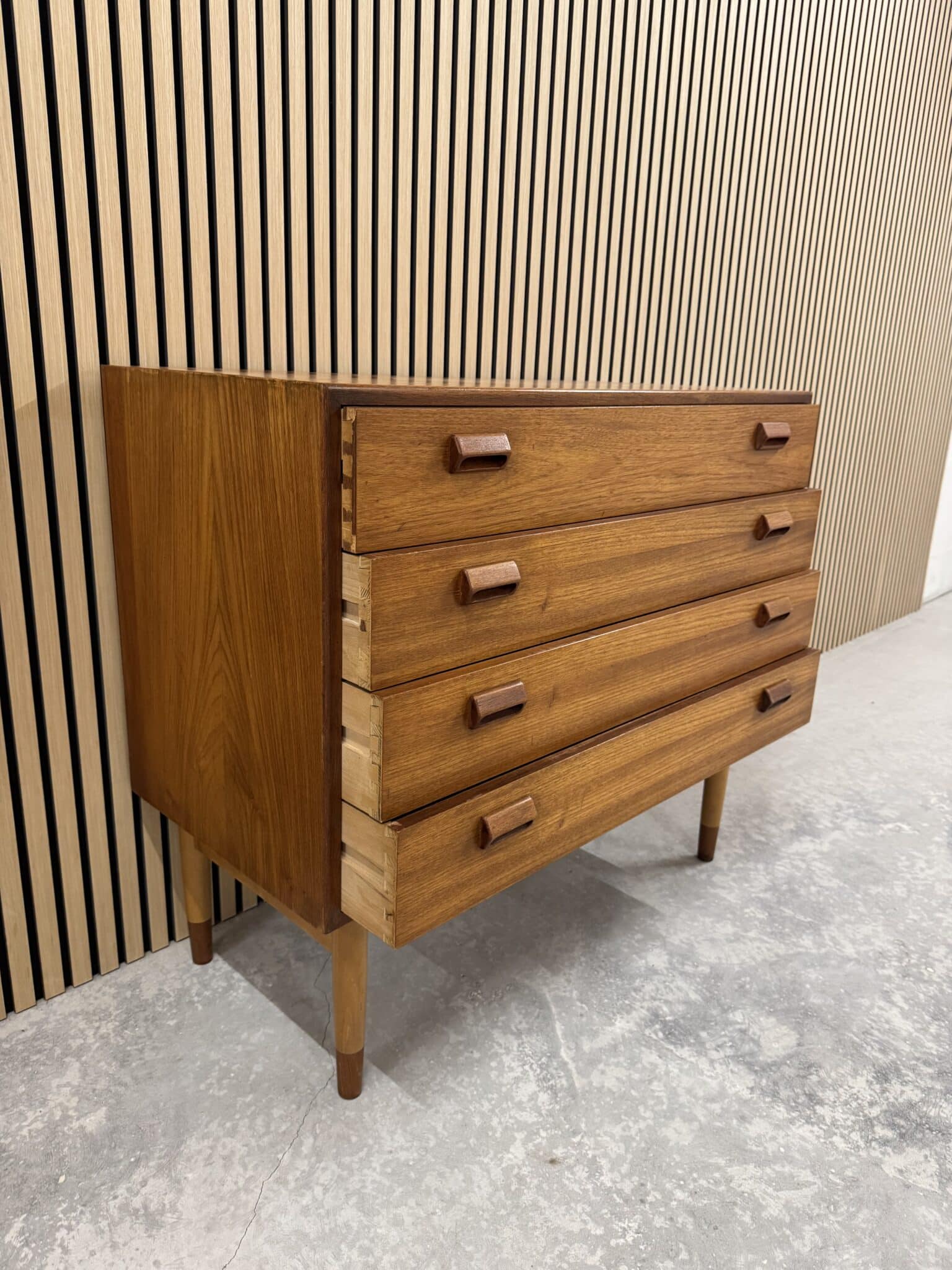 Kommoden er produceret med 4 skuffer, samt et stel af massiv bøg og sko af teak.