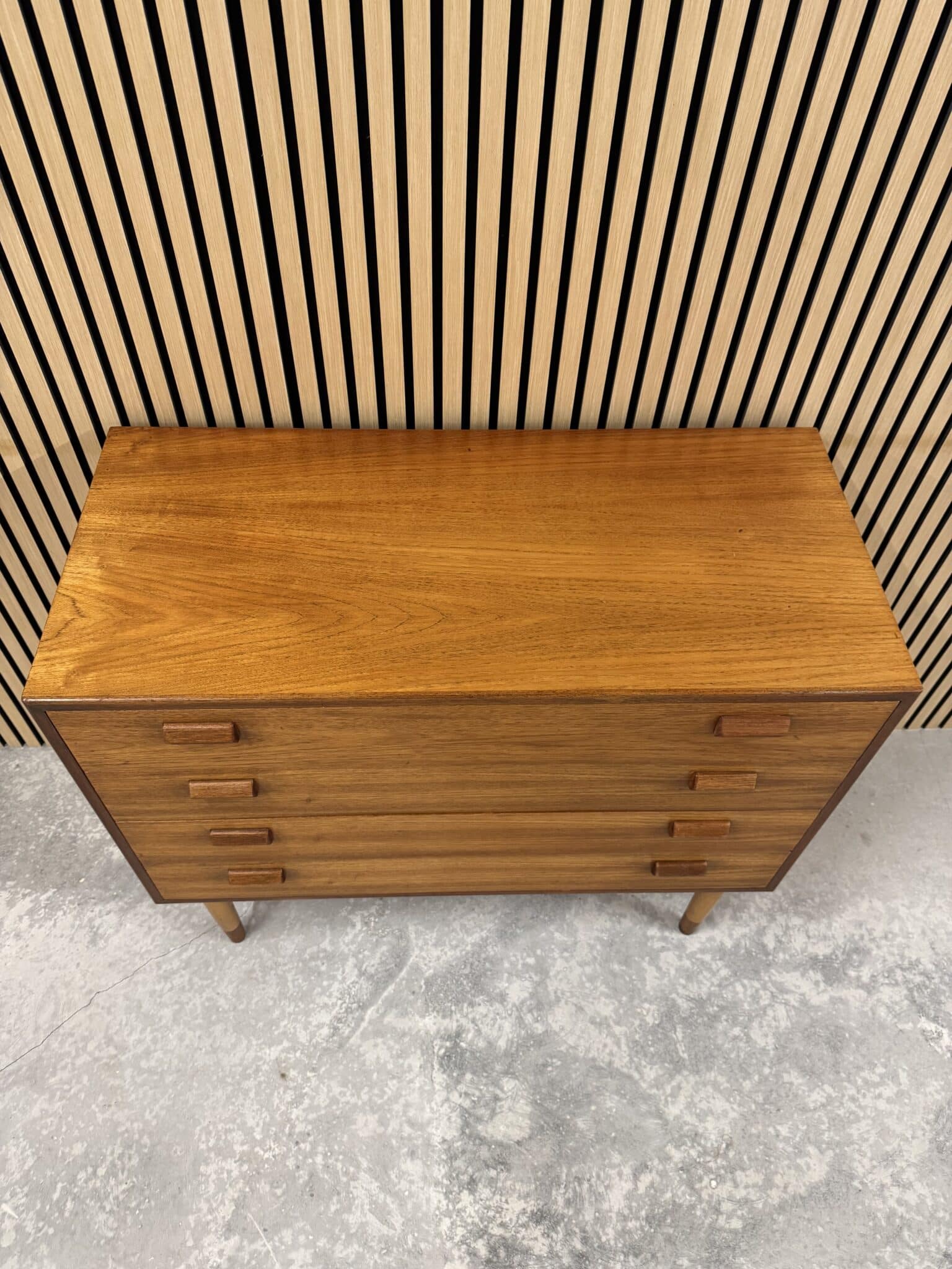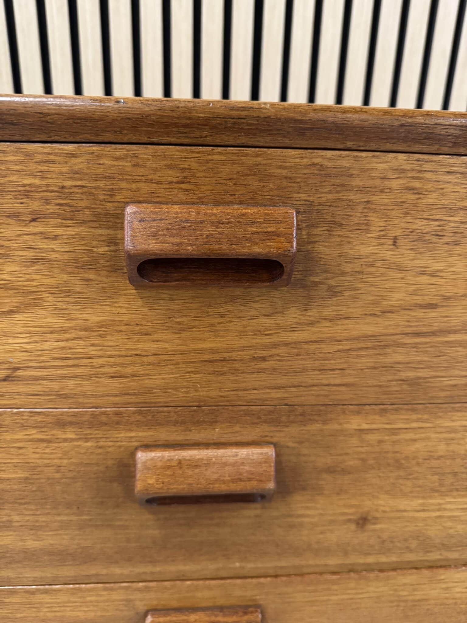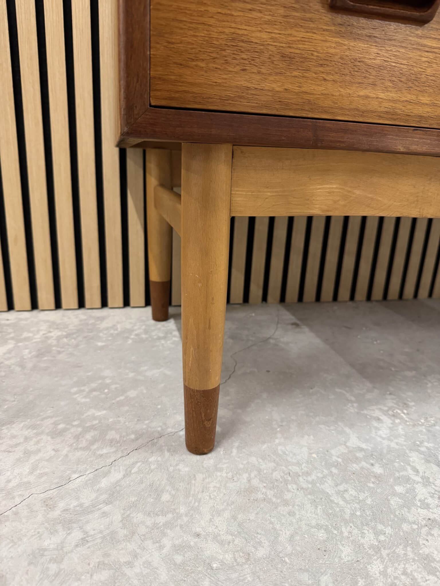 Kommoden er produceret med 4 skuffer, samt et stel af massiv bøg og sko af teak.
