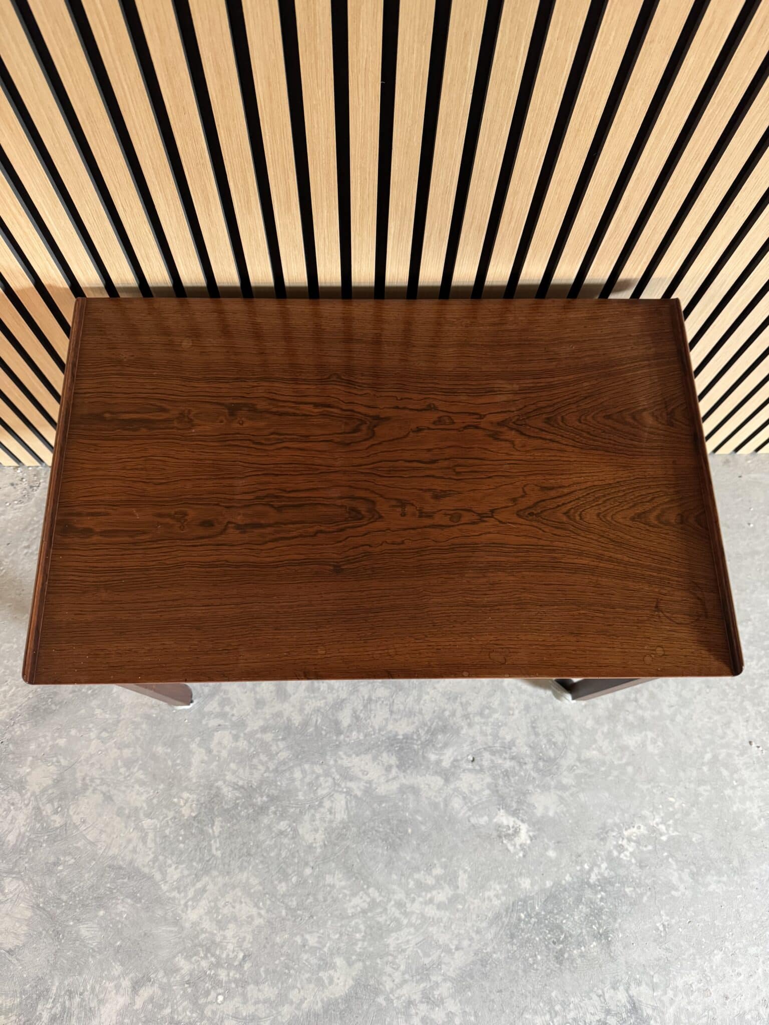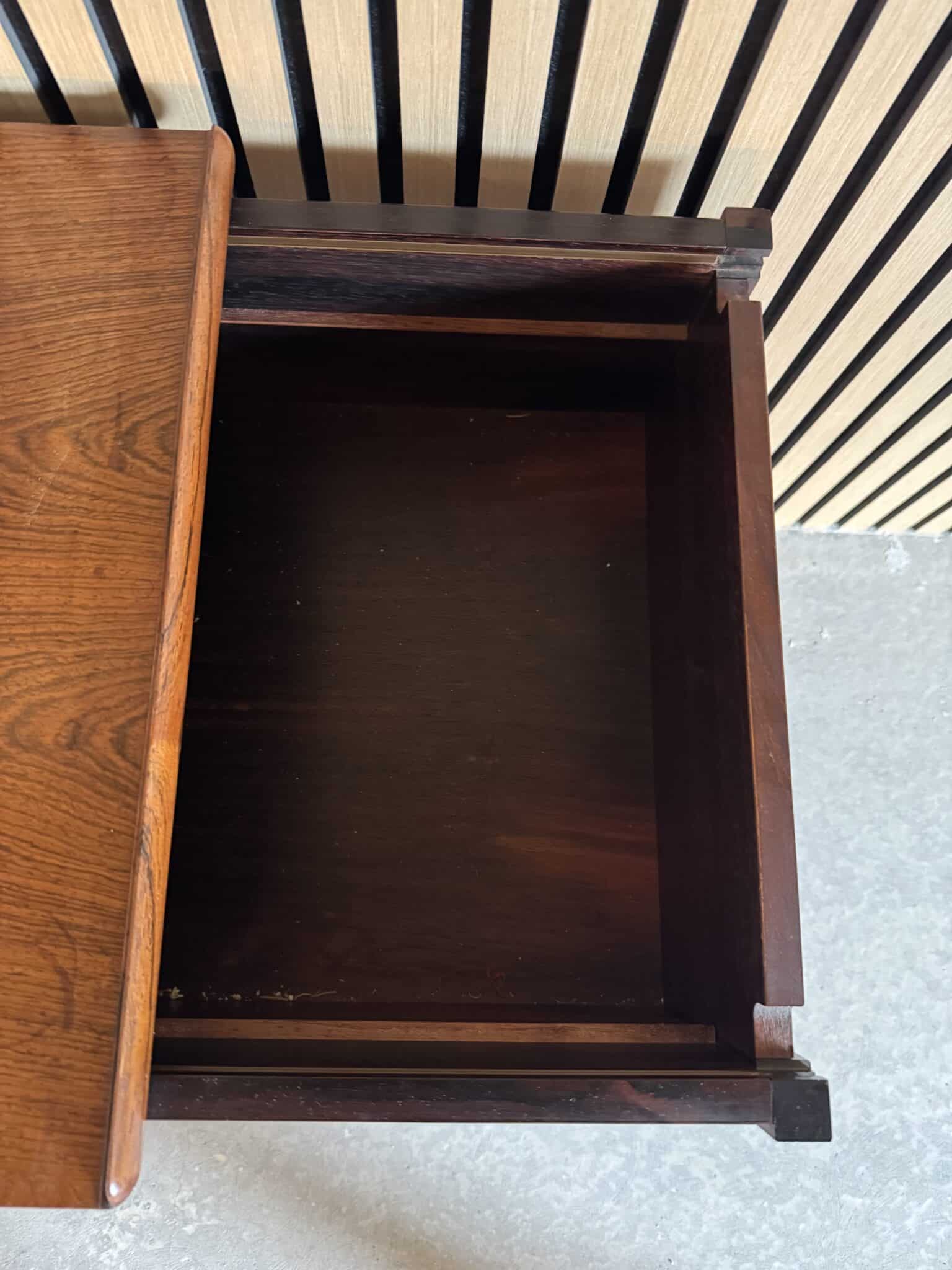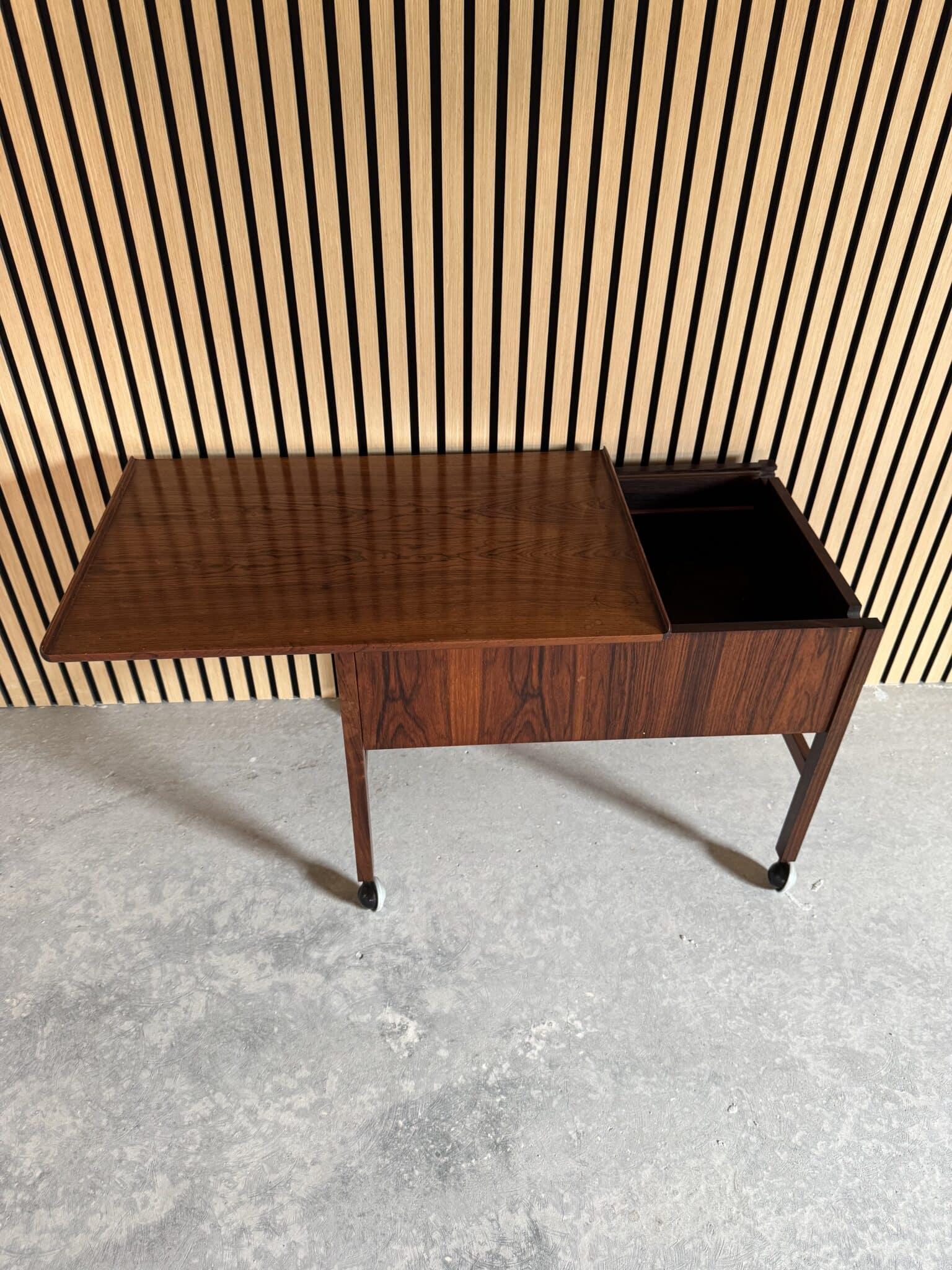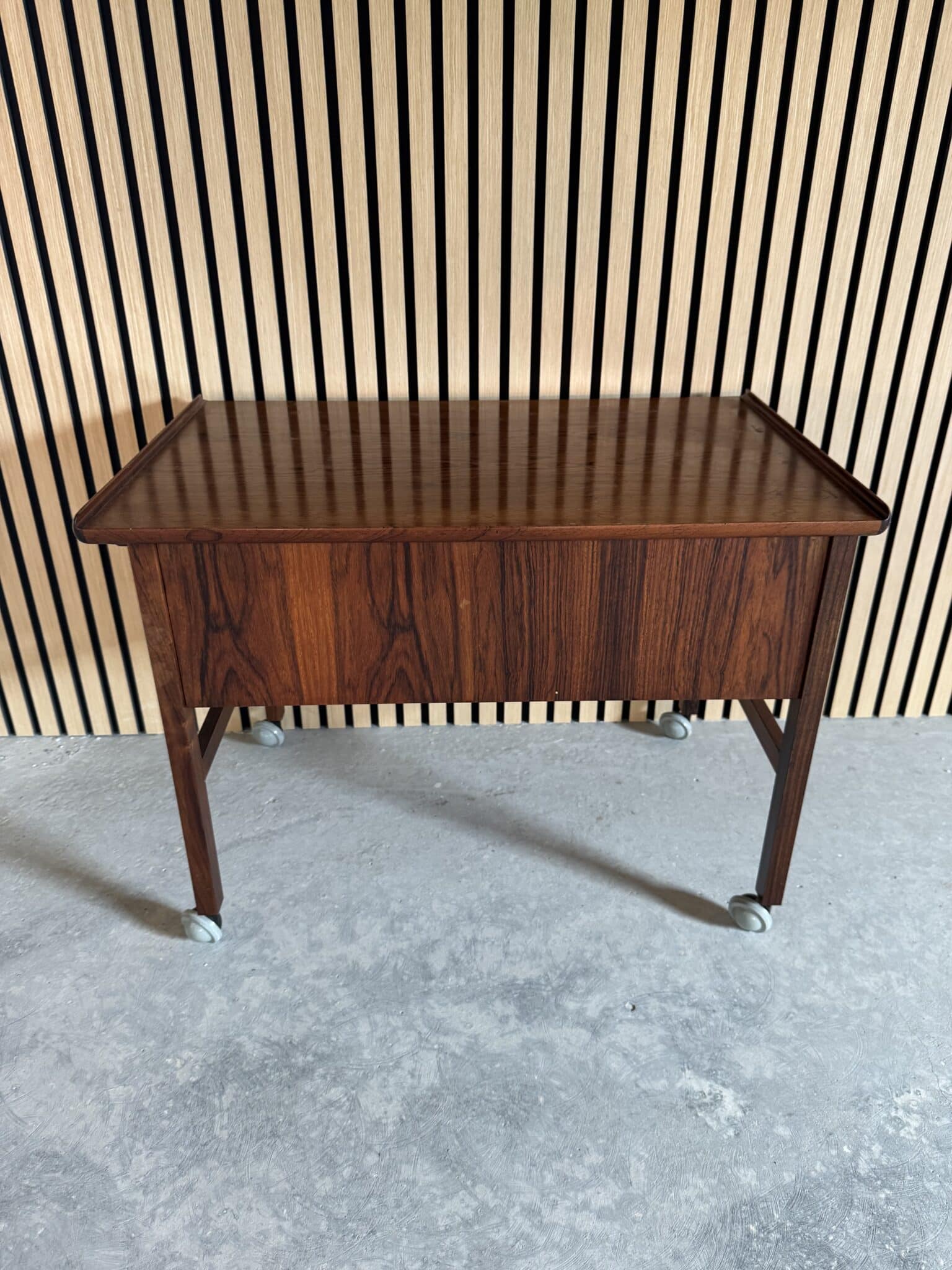 Sybordet er produceret i delvis massiv palisander, toppladen er fineret samt opbevarings rummet under.
