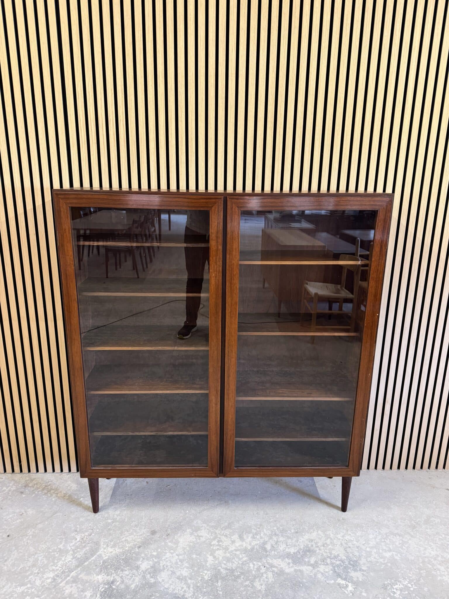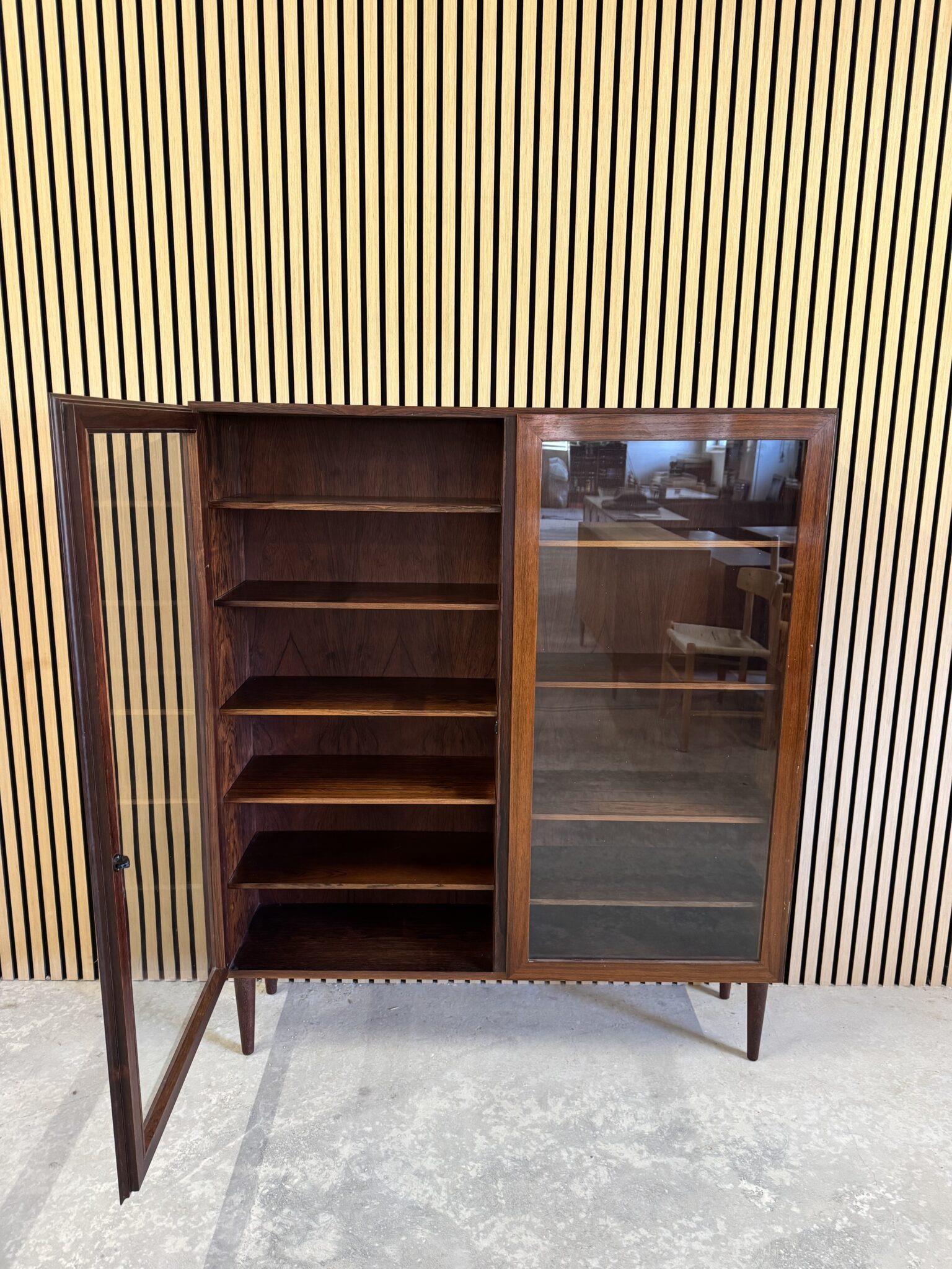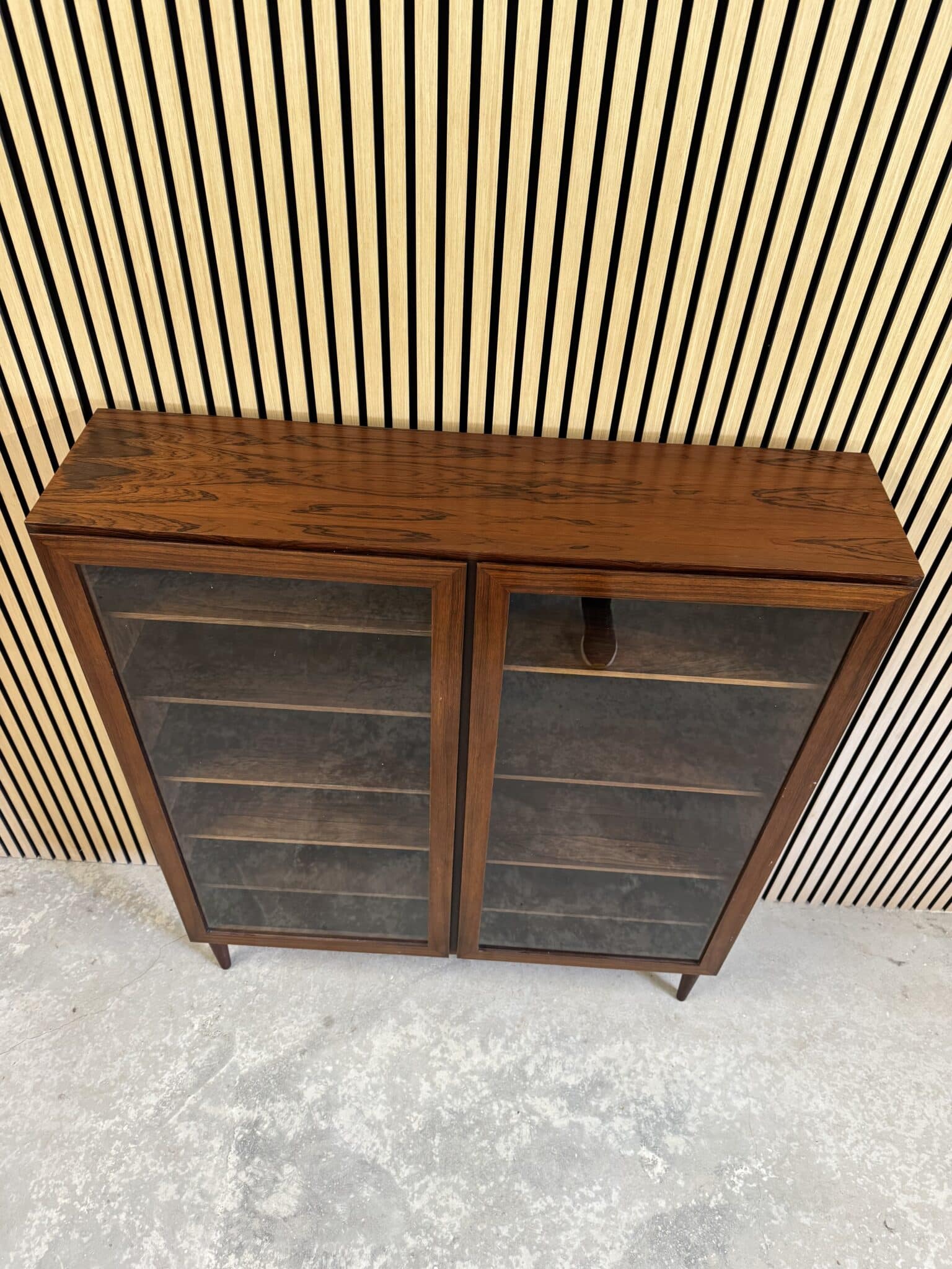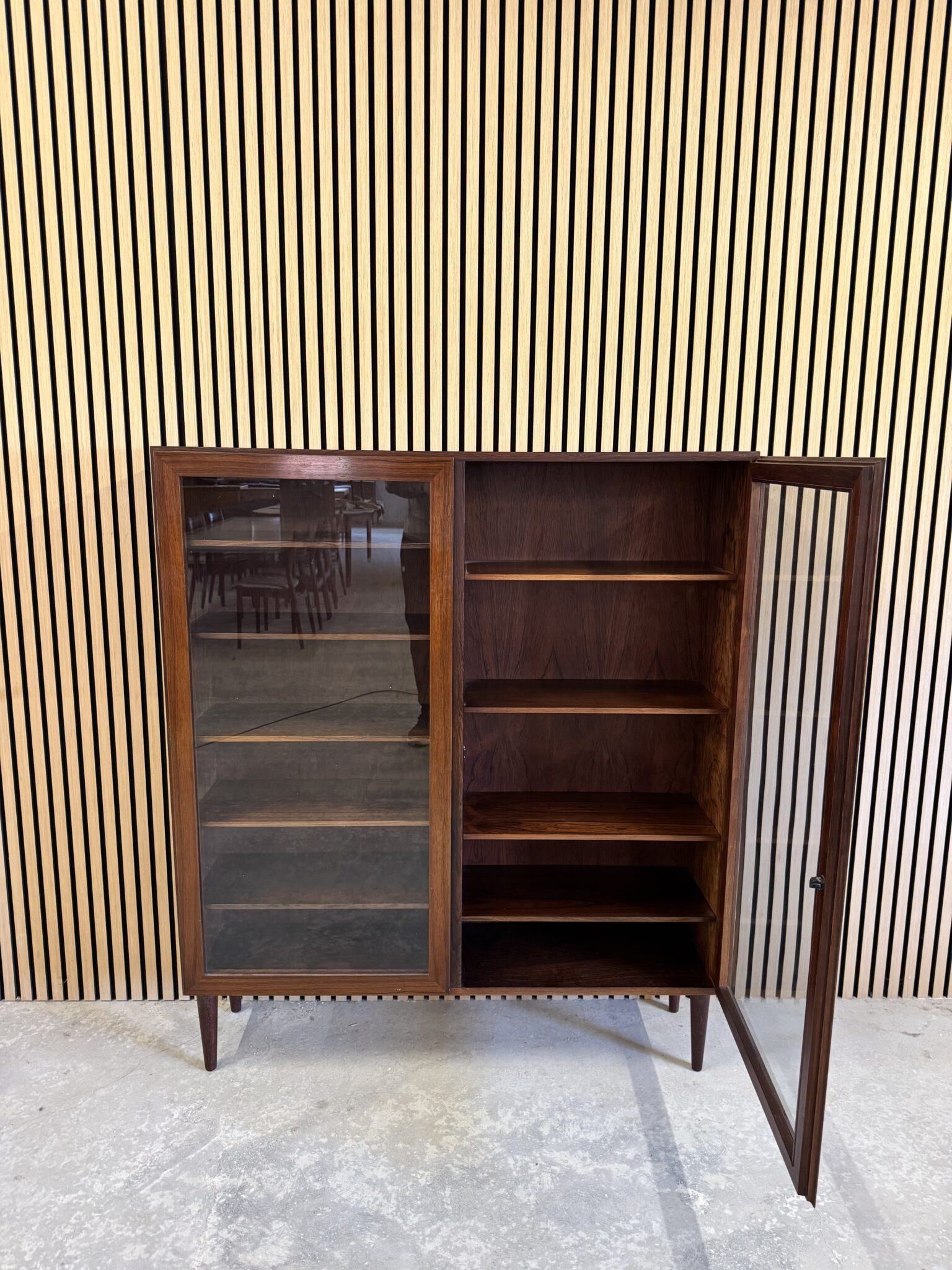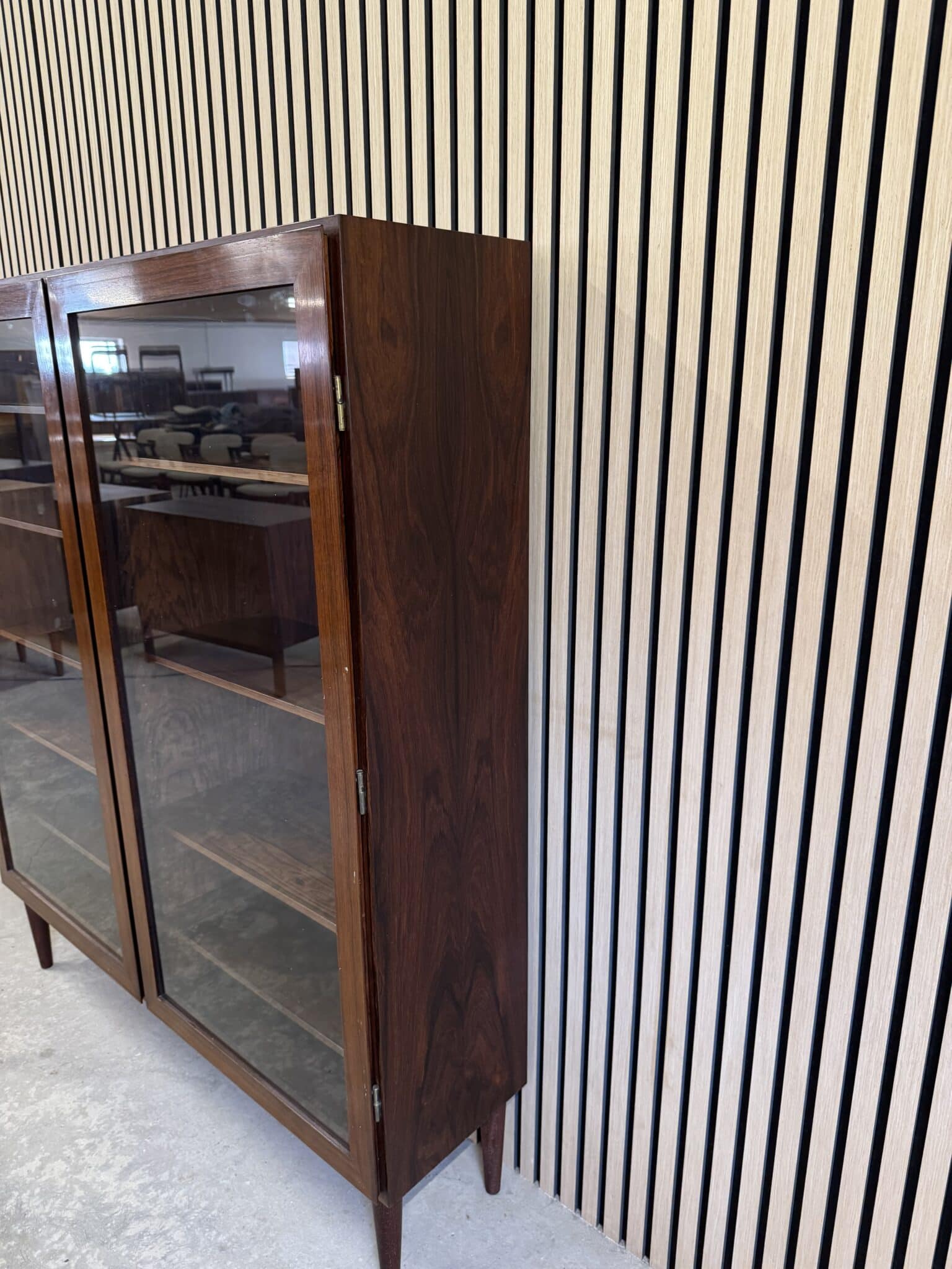 Vitrinen er produceret i fineret palisander, med eftermonteret ben.