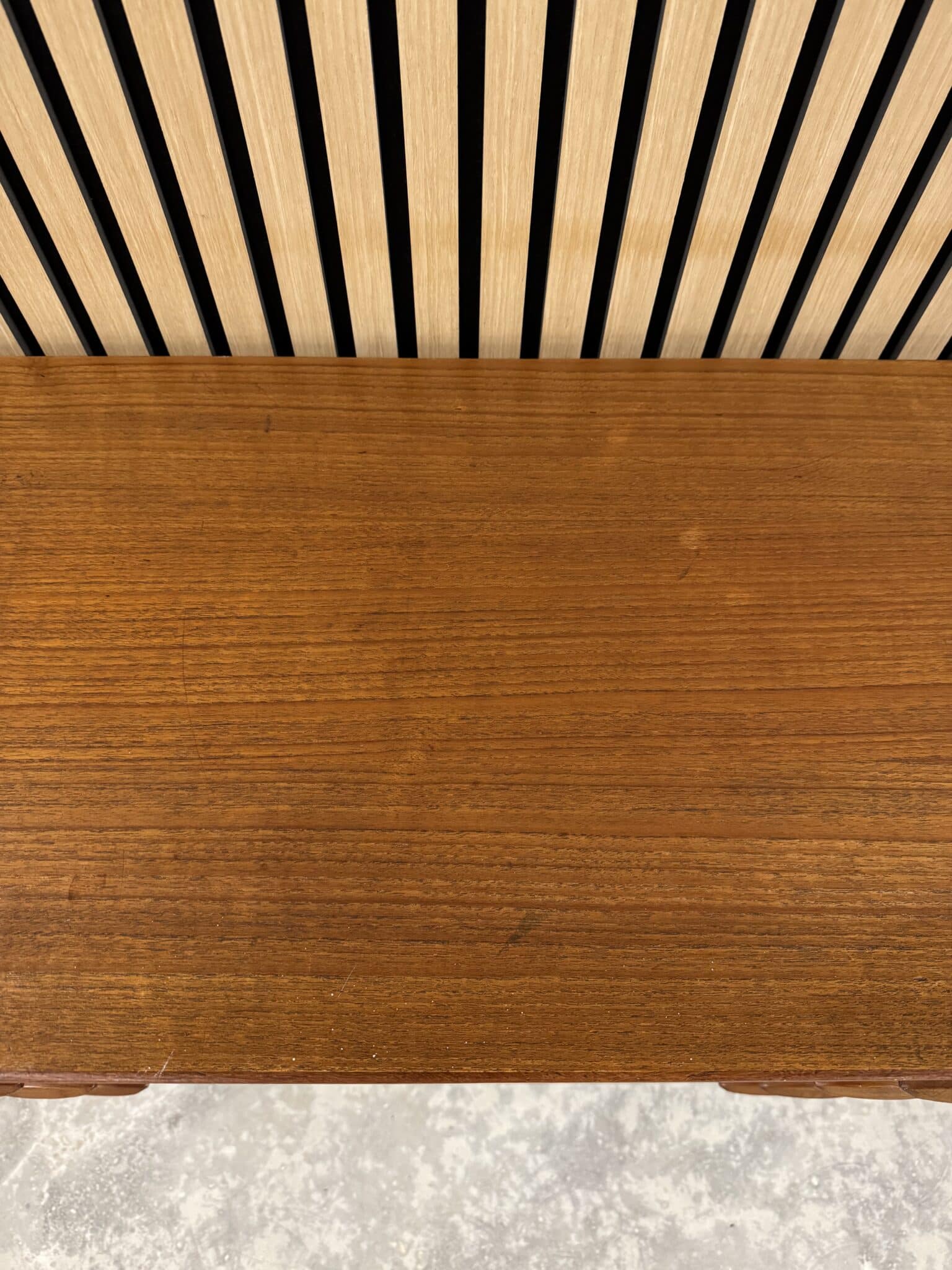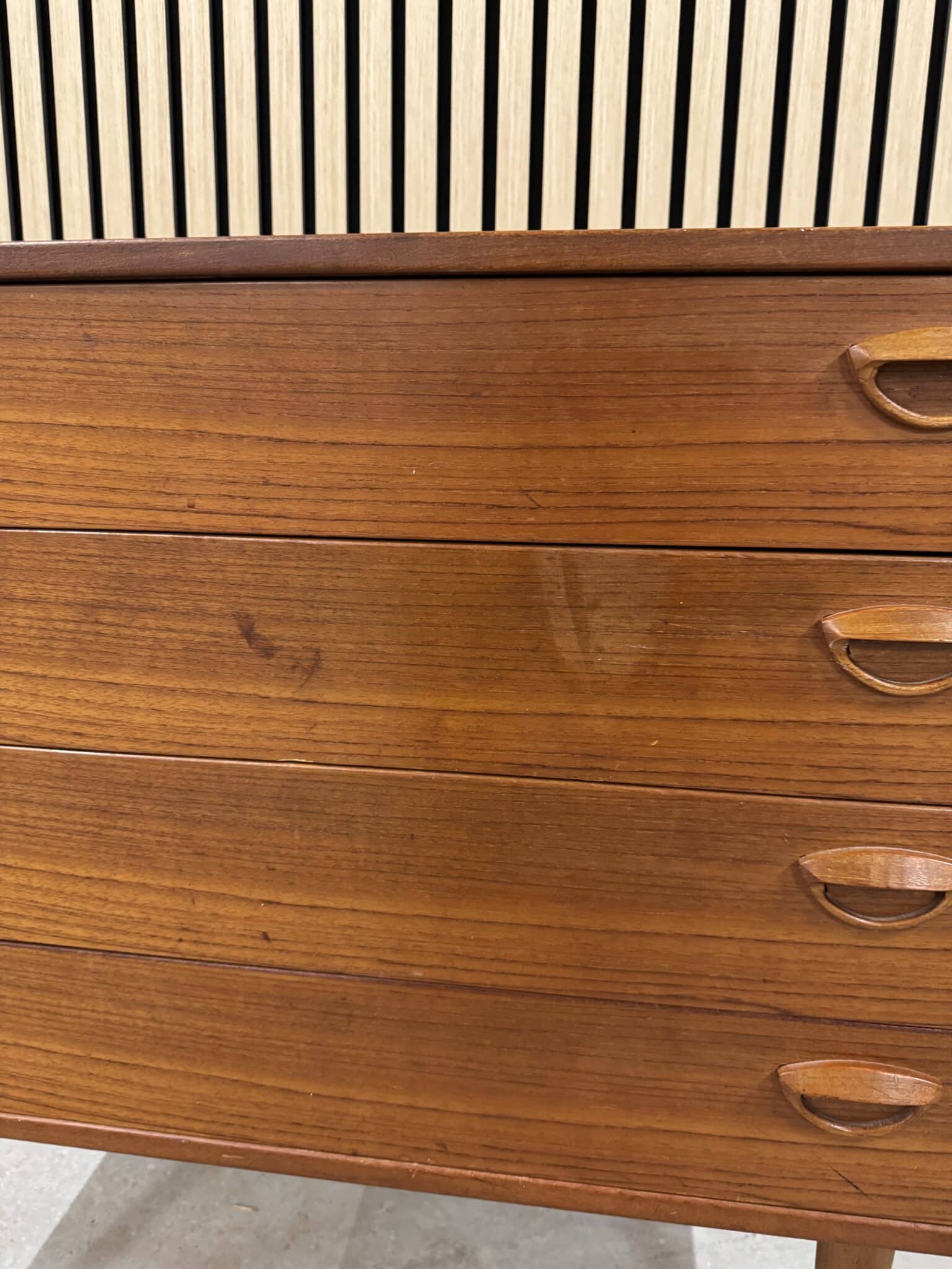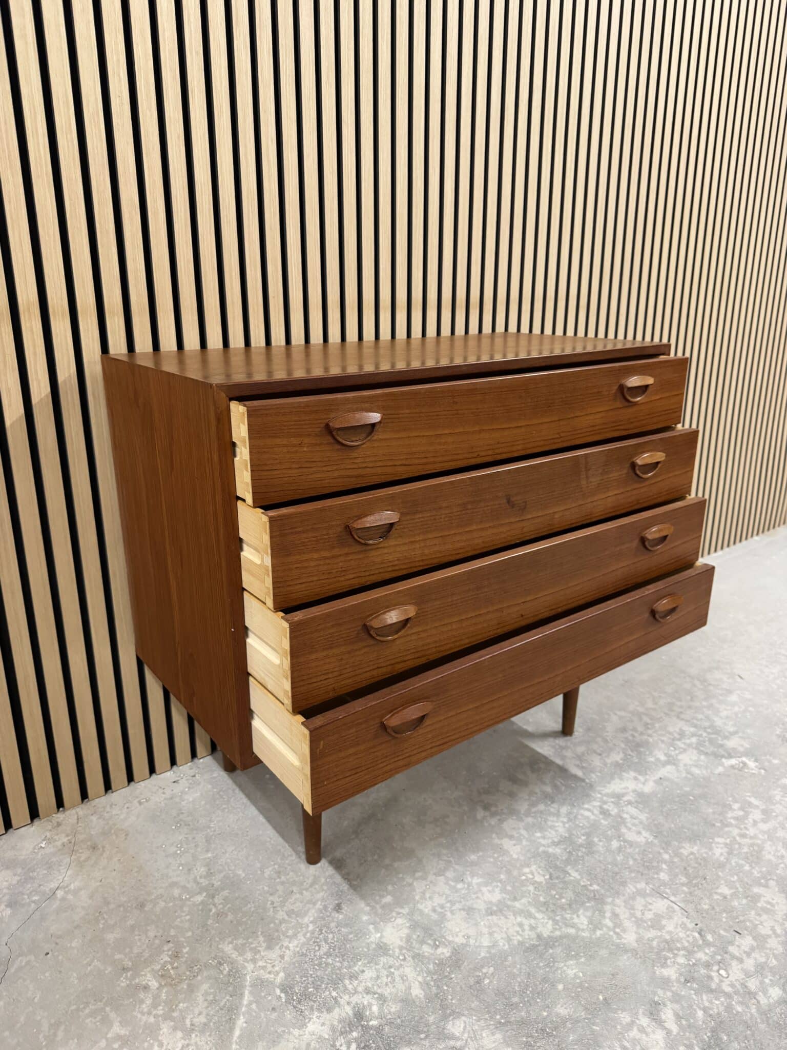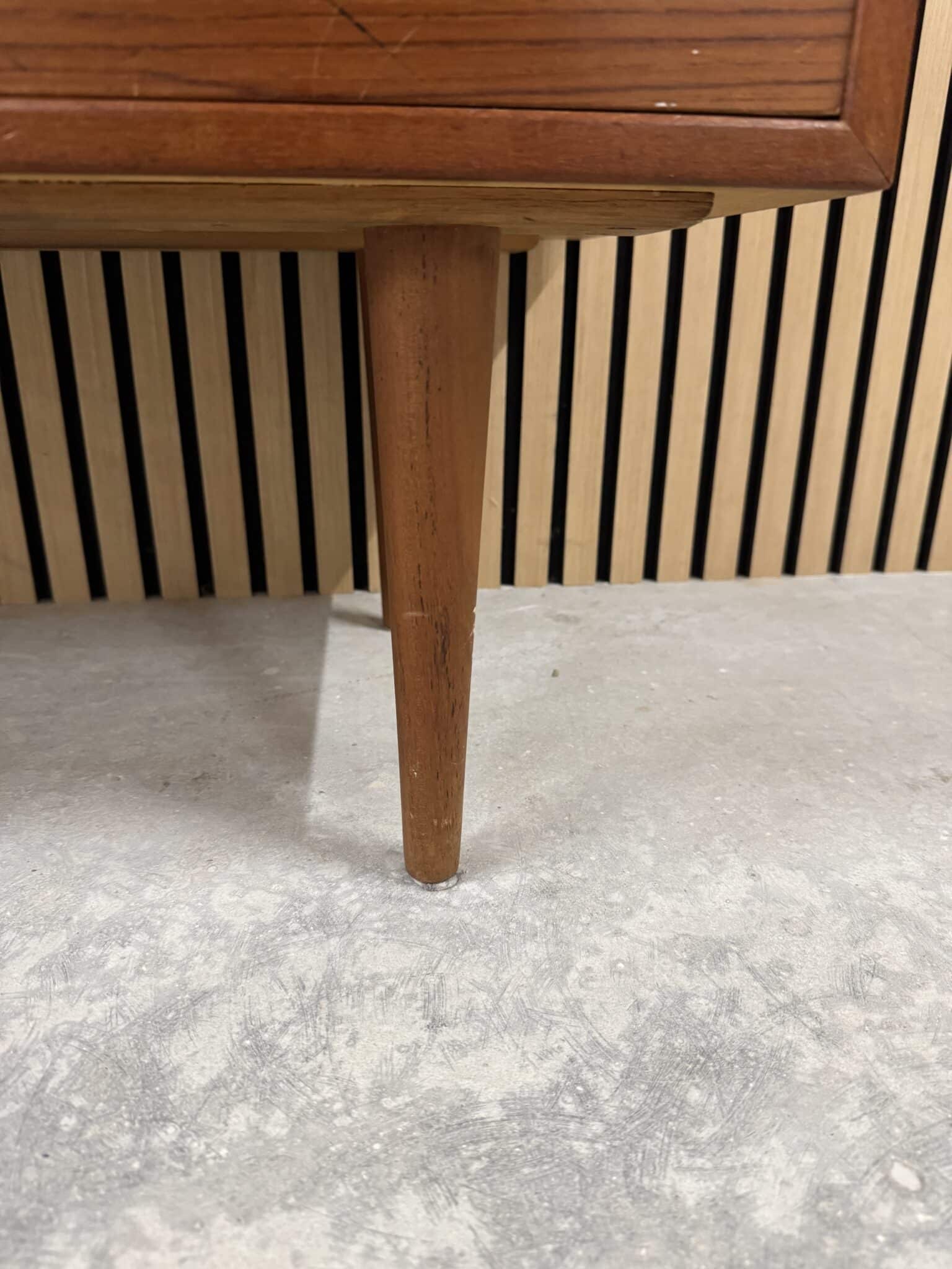 Kommoden er produceret i fineret teak, med originale ben af massiv teak.