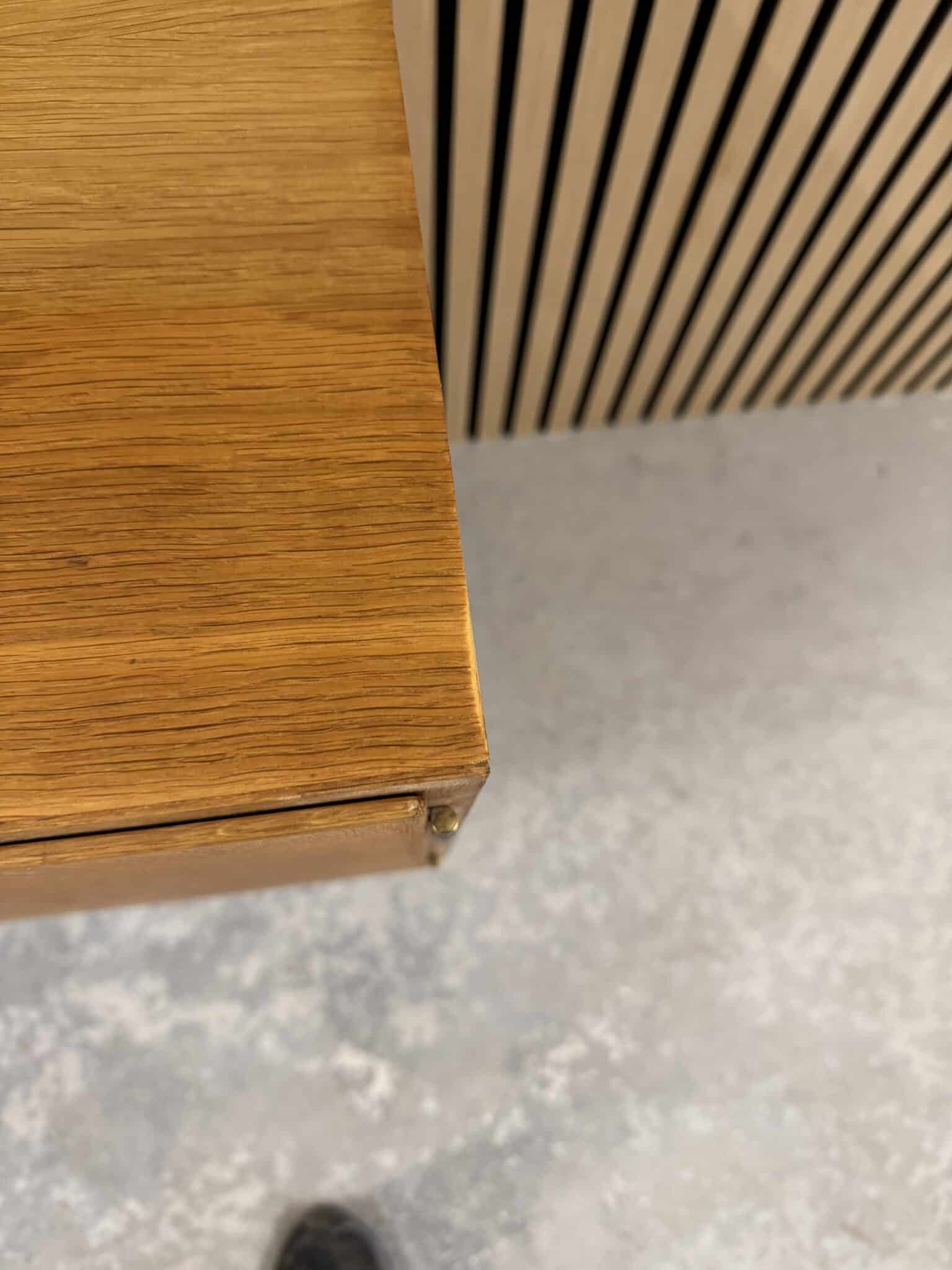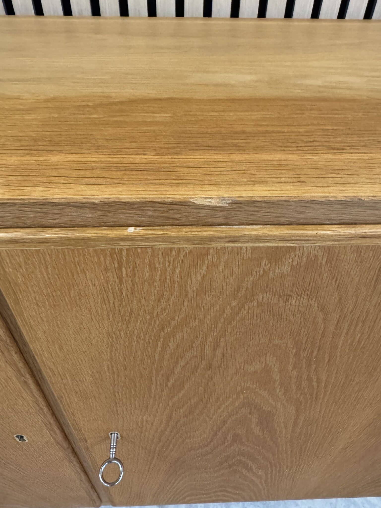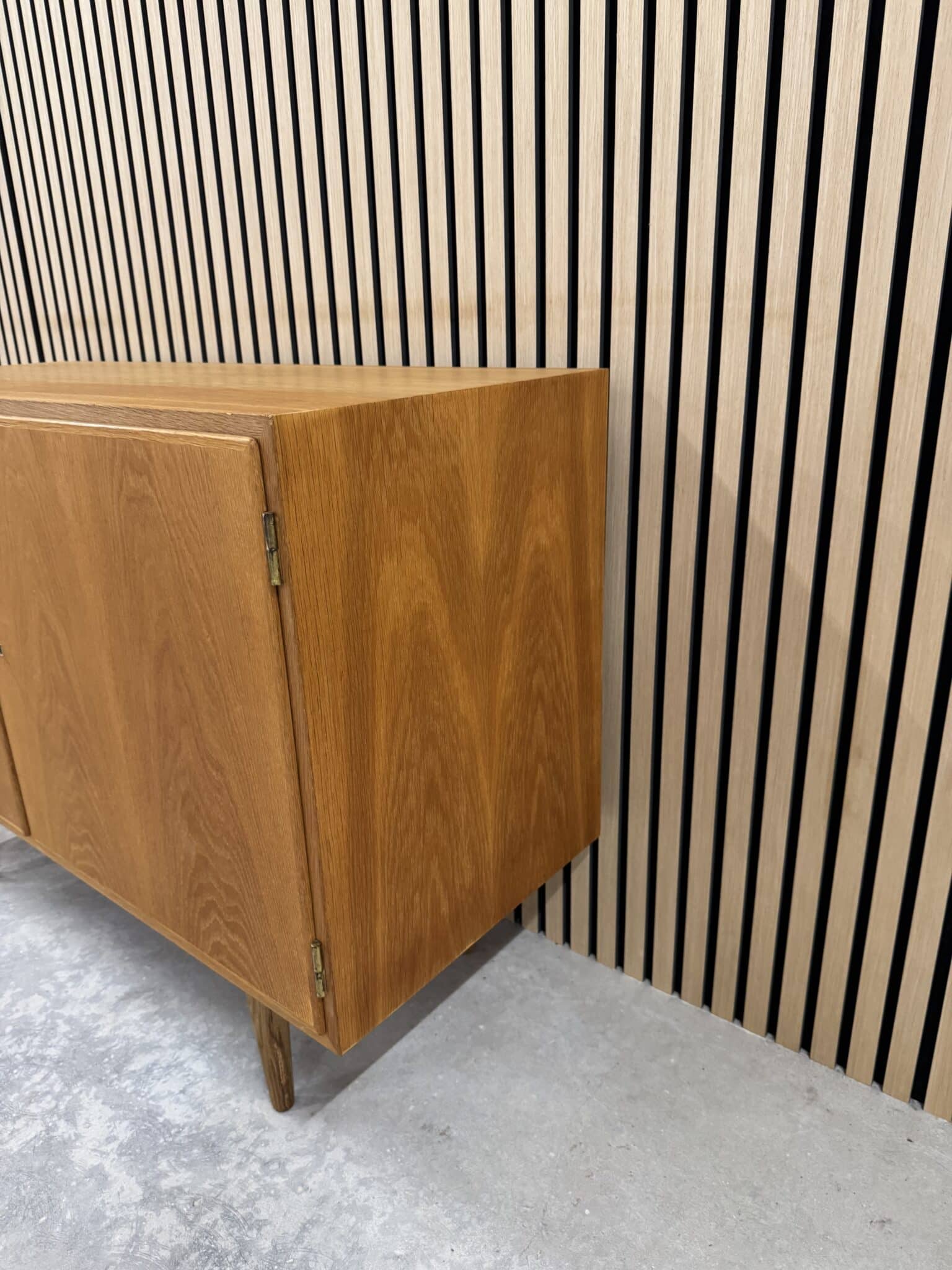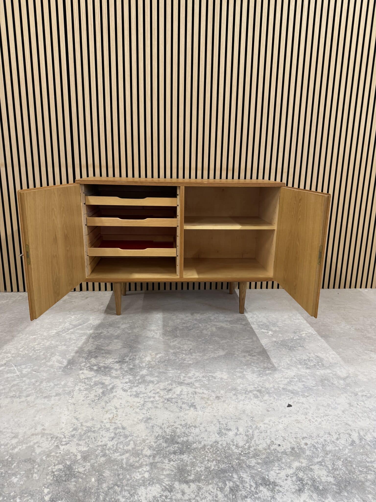 Skænken er produceret i Fineret egetræ, med eftermonteret ben.